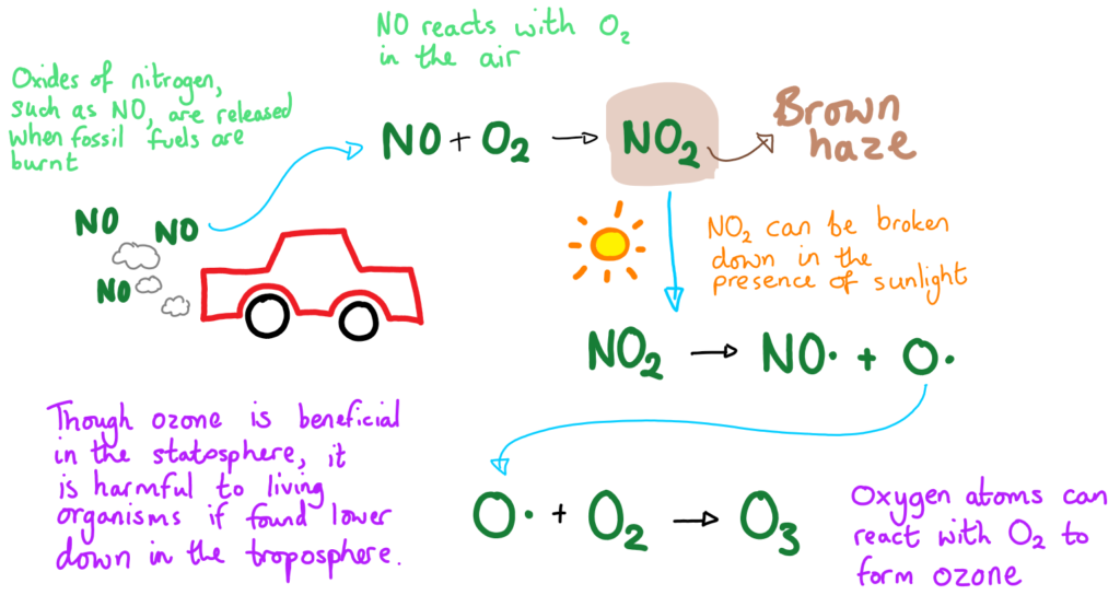 Under sunlight, these pollutants undergo photochemical reactions (i.e. they react with with the help of energy from the sun), producing ground-level ozone (O₃) and other secondary pollutants. The resulting mixture of ozone, nitrogen oxides, and particulates creates the harmful phenomenon known as photochemical smog, which can cause respiratory problems and environmental harm.